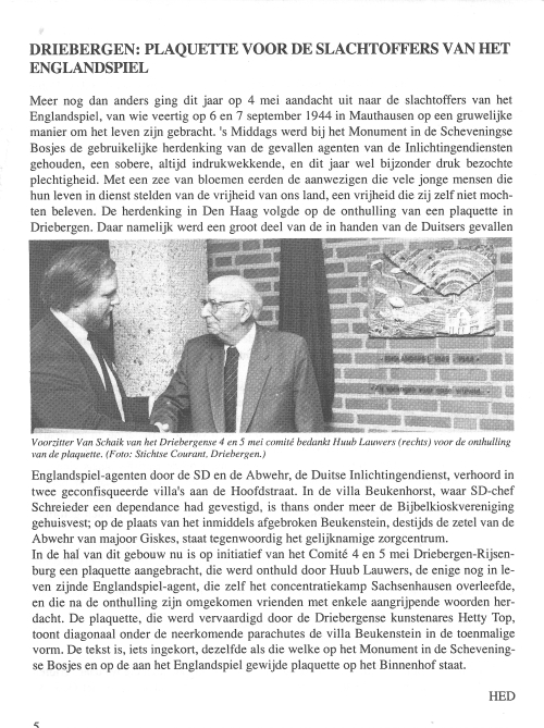Artikel over de gedenkplaat in Beukenstein, onthuld door H. Lauwers.