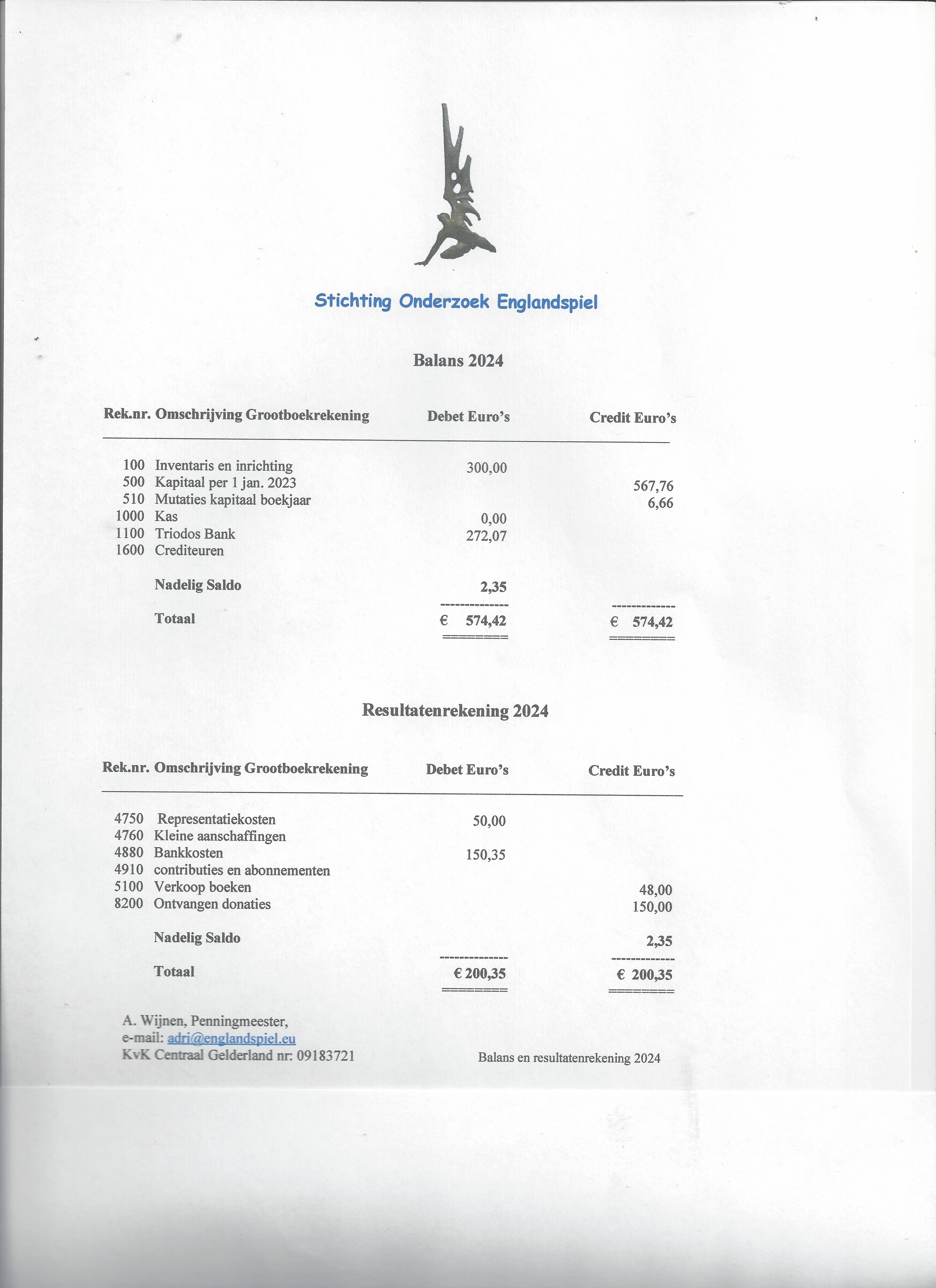 - Wilt u contact opnemen dan kan dat via een email aan een van bovenstaande bestuursleden. - Het adres voor de gewone post vindt u door hier met de muis op te gaan staan. - Klik hier om de balans en resultatenrekening voor 2024 weer te gegeven. - Voor het beleidsplan klikt u hier.