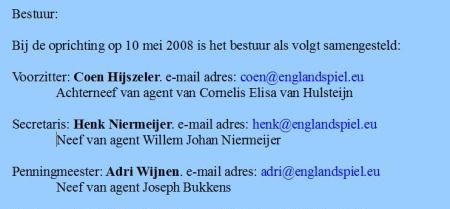 Stichting SOEOp 10 mei 1940 vielen de nazi´s Nederland binnen. Ook omstreeks deze dagen installeerde Churchill een nieuwe geheime dienst. Deze nieuwe dienst werd samengesteld uit een aantal kleinere reeds bestaande organisaties. Het was de SOE. Special Operations Executive. De dienst die de agenten later uit ging zenden en waarbij het nodige mis ging. Meer hierover bij Organisaties / SOE - SIS en Organisaties / Het spel. Op 10 mei 2008 is een Stichting Onderzoek Englandspiel opgericht. Afgekort Stichting SOE Met welk doel en waarom deze nieuwe Stichting?Het doel ligt in de naam besloten, het doen van onderzoek en zoals dat zo mooi heet: "waarheidsvinding". Ook het bij elkaar houden van de onderzoeksresultaten en de "Englandspiel bibliotheek" heeft bijgedragen om tot een stichting te komen. De boeken en aanwezige onderzoeken breng ik om niet in de stichting in. In de statuten staat: DoelArtikel 3
